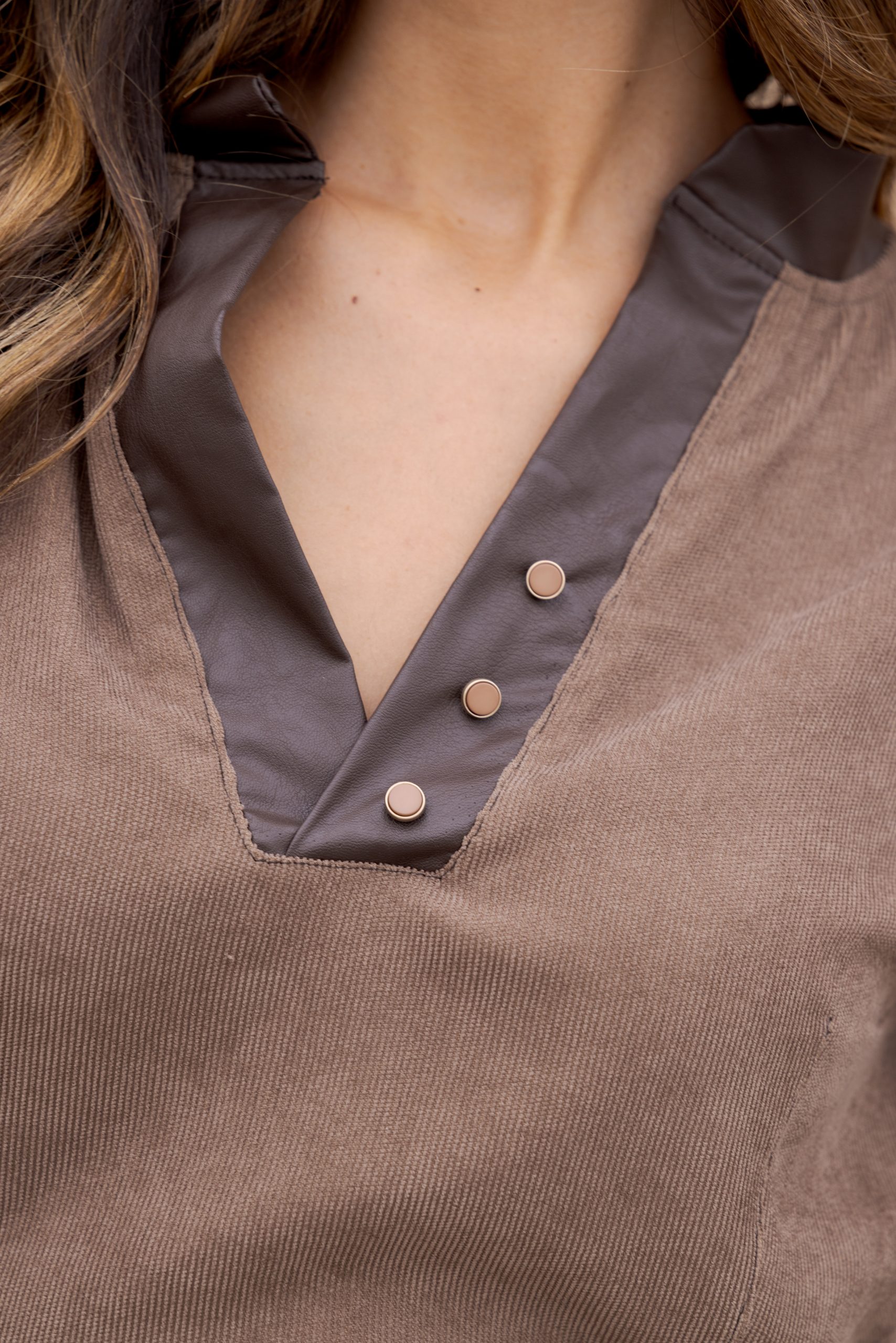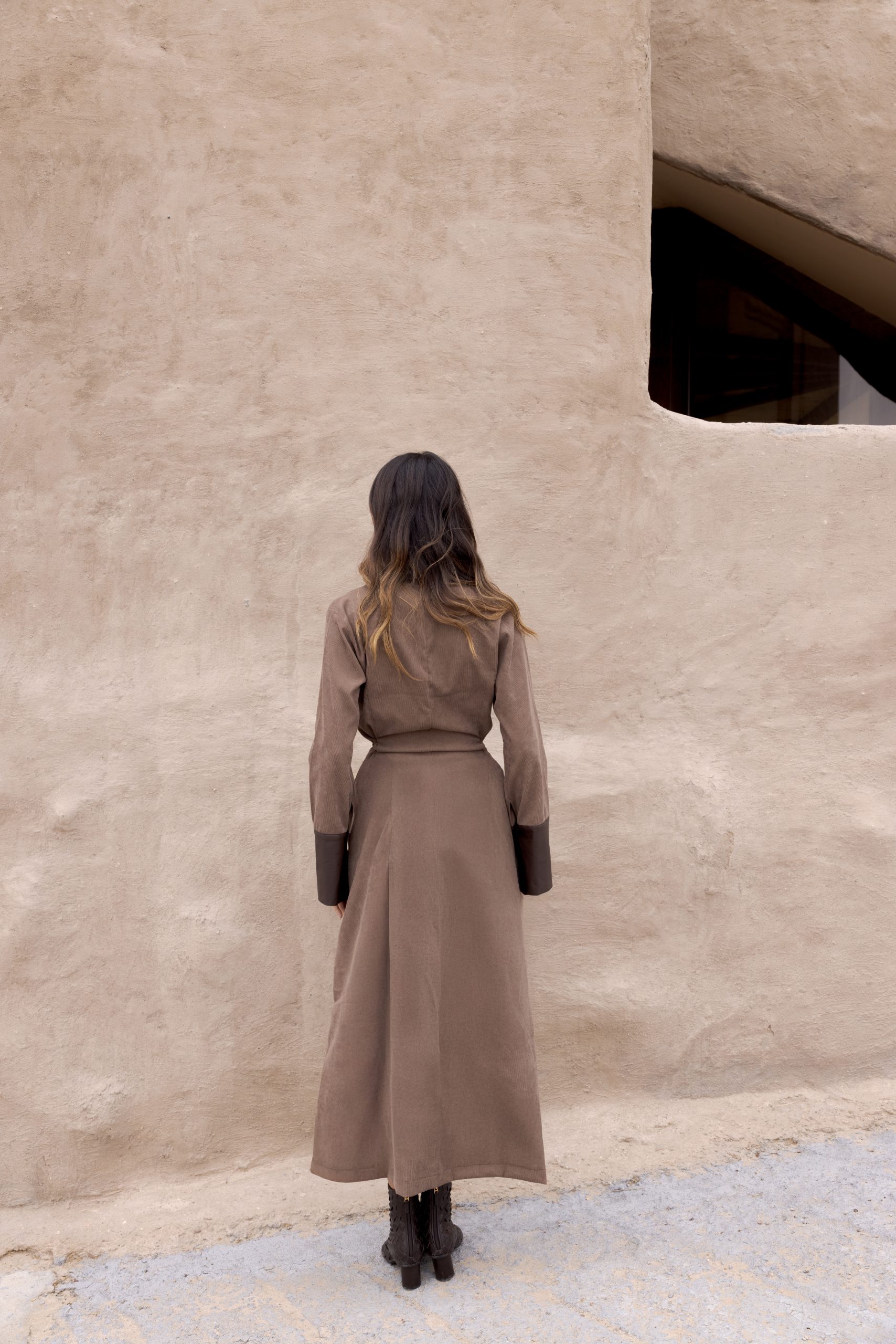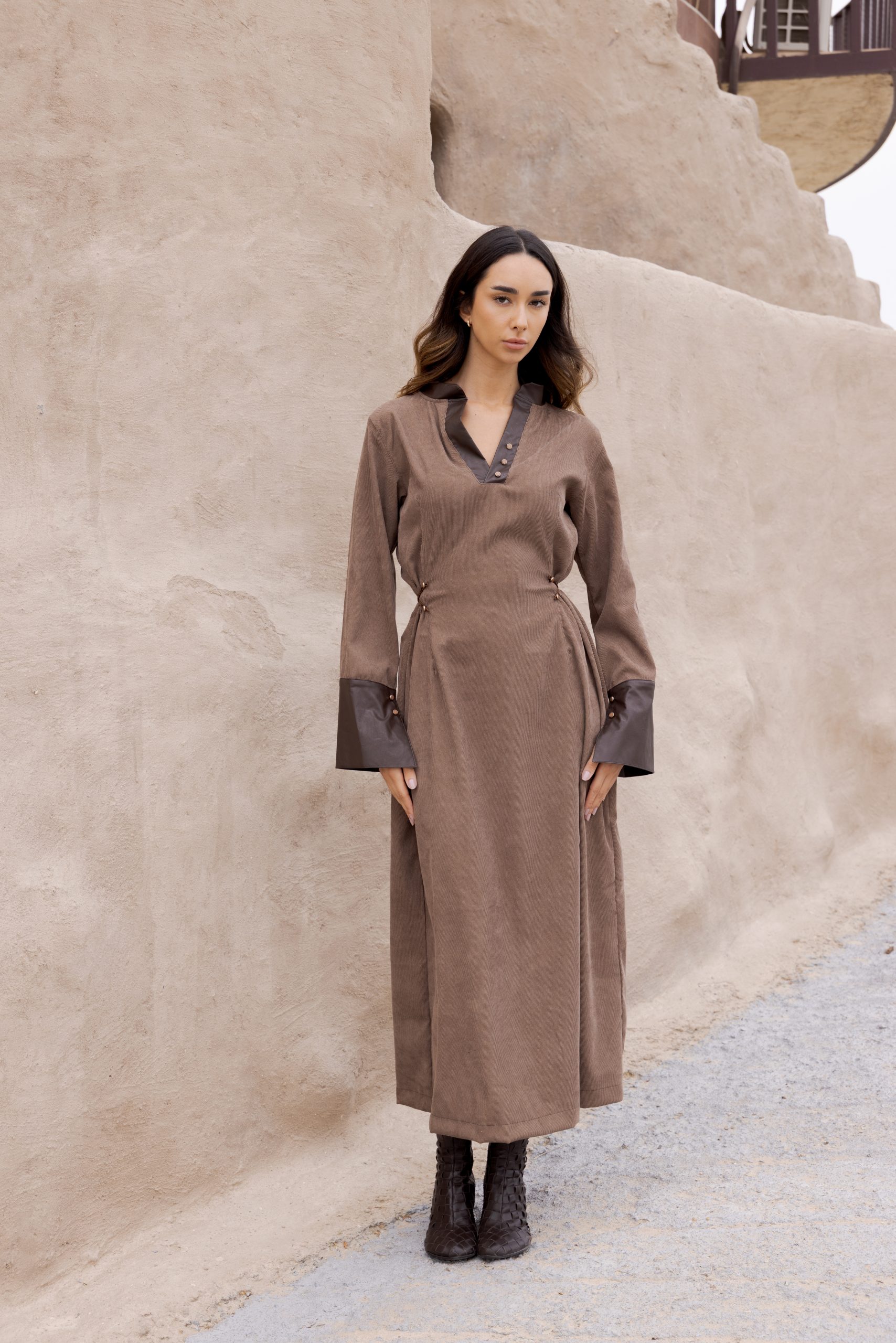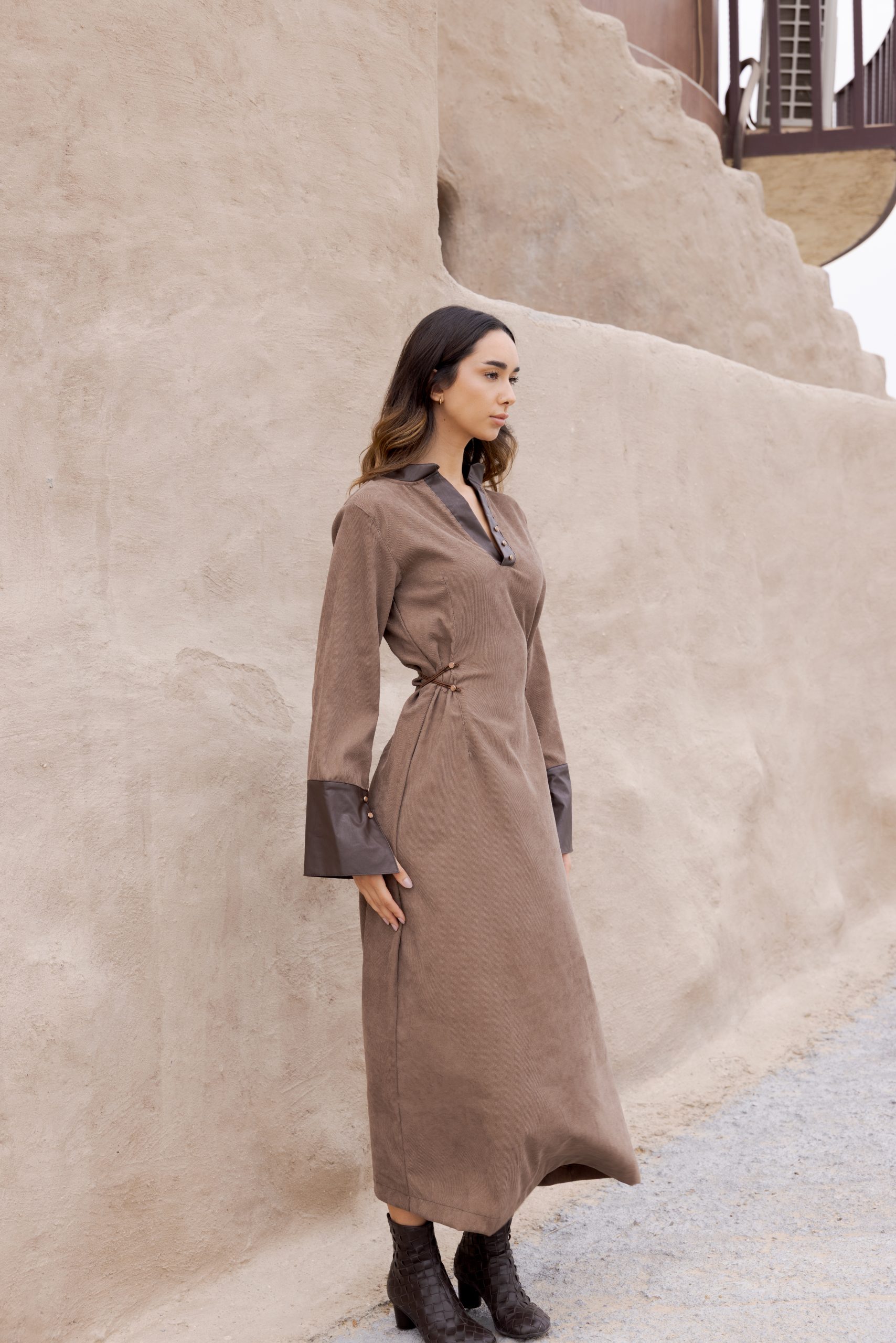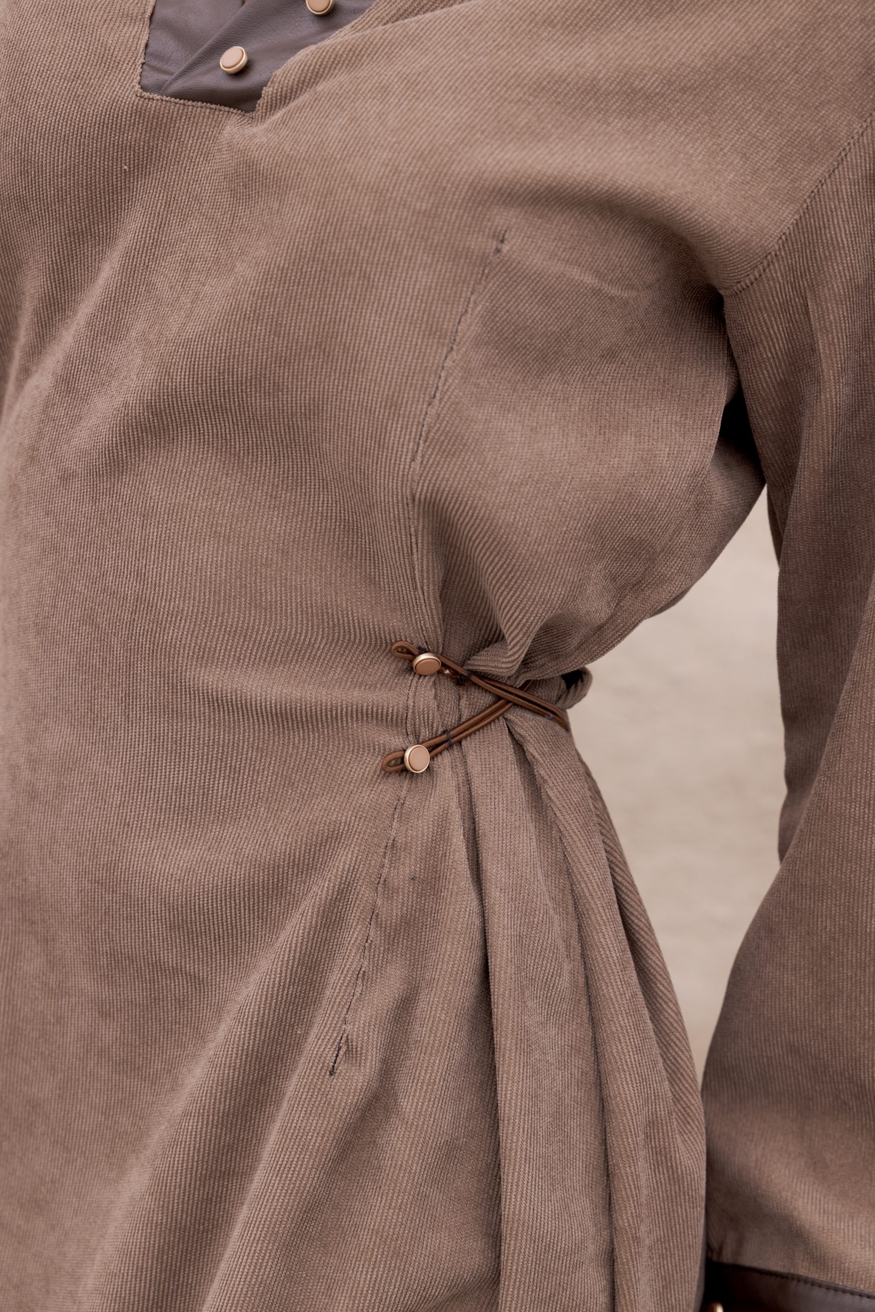 A taupe corduroy dress, accented with dark brown leather trim, offers a modern silhouette with elastic bands that create a comfortable, cinched waist effect.