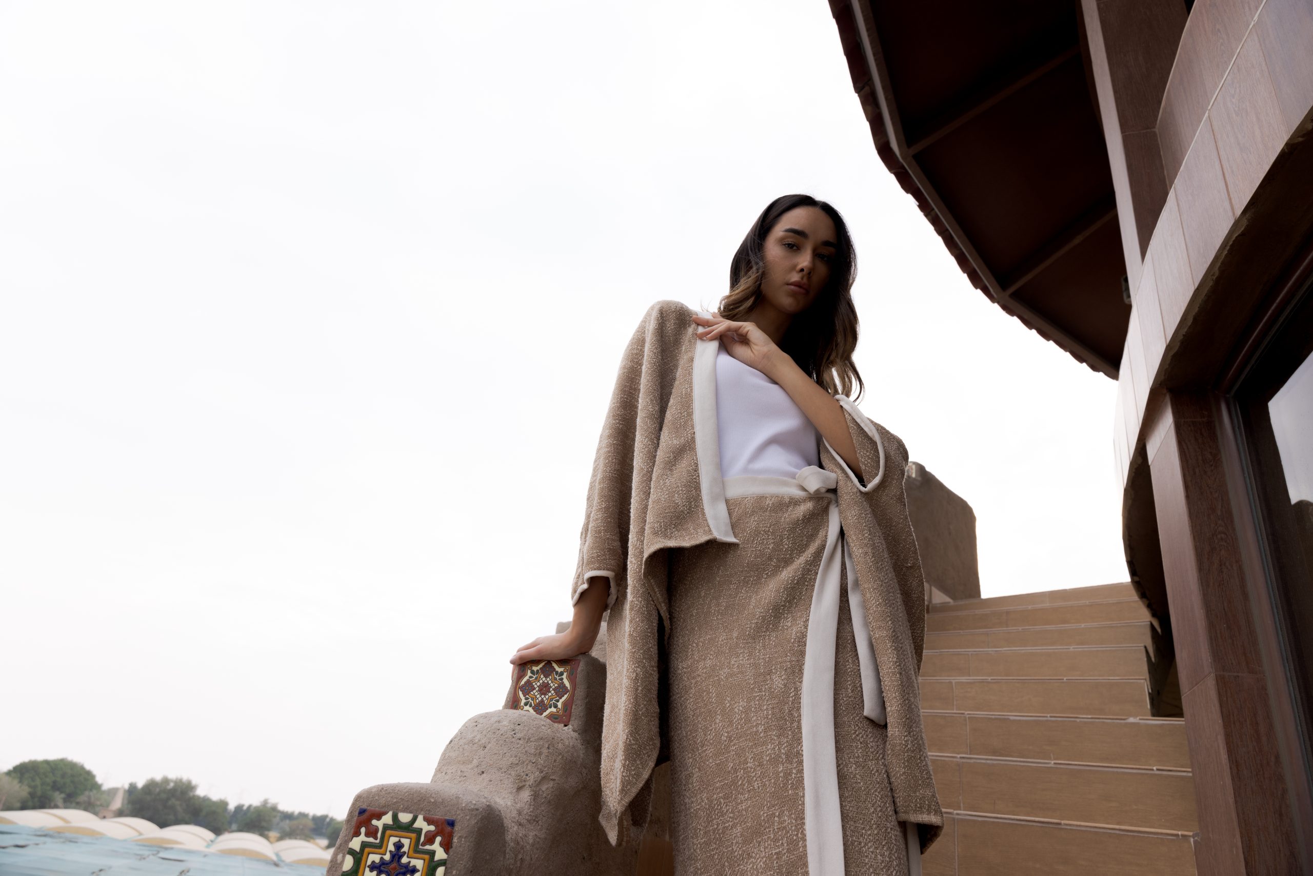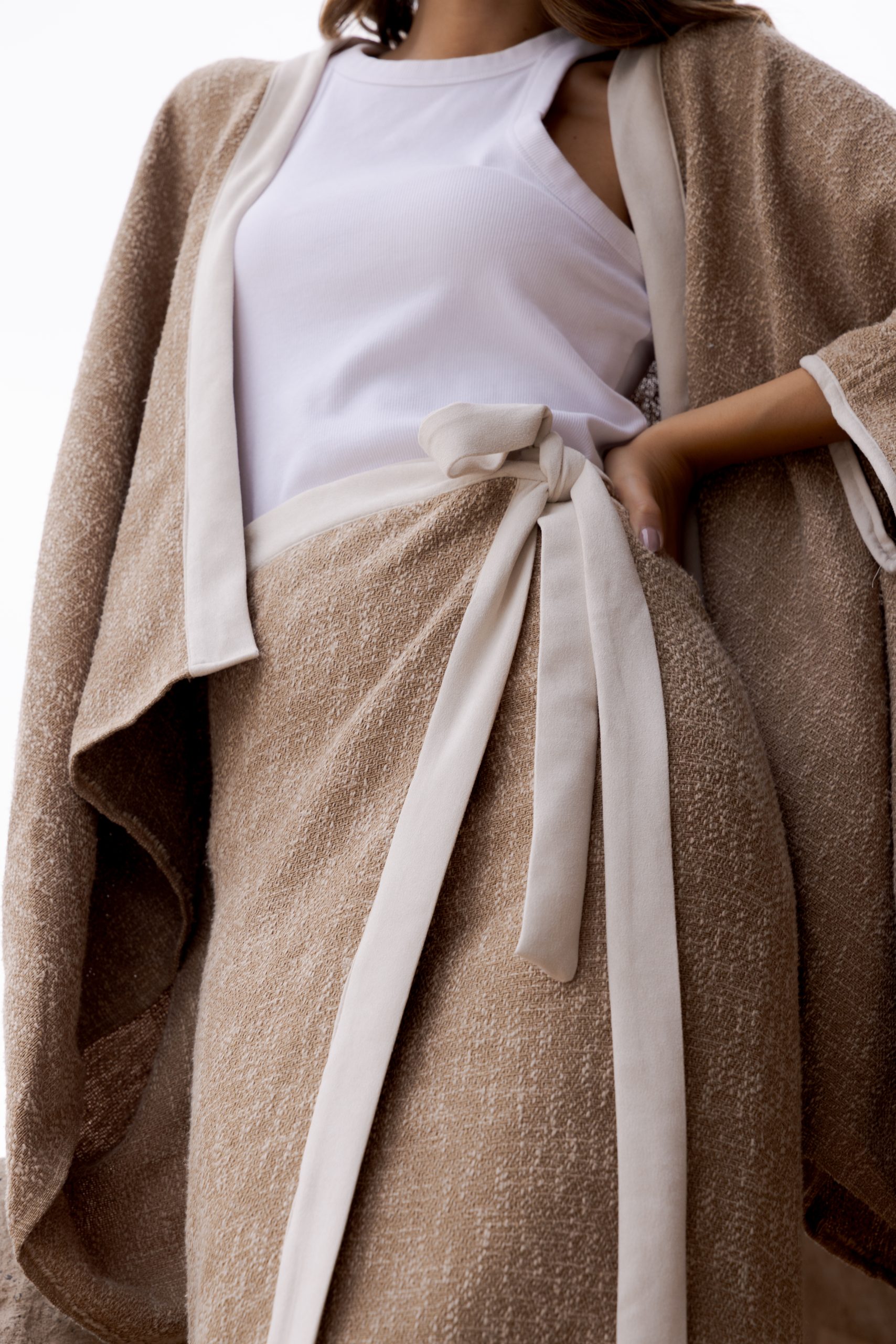 A wrap canvas cotton skirt, featuring adjustable openings for a customizable fit. Paired with a free flowing jacket.