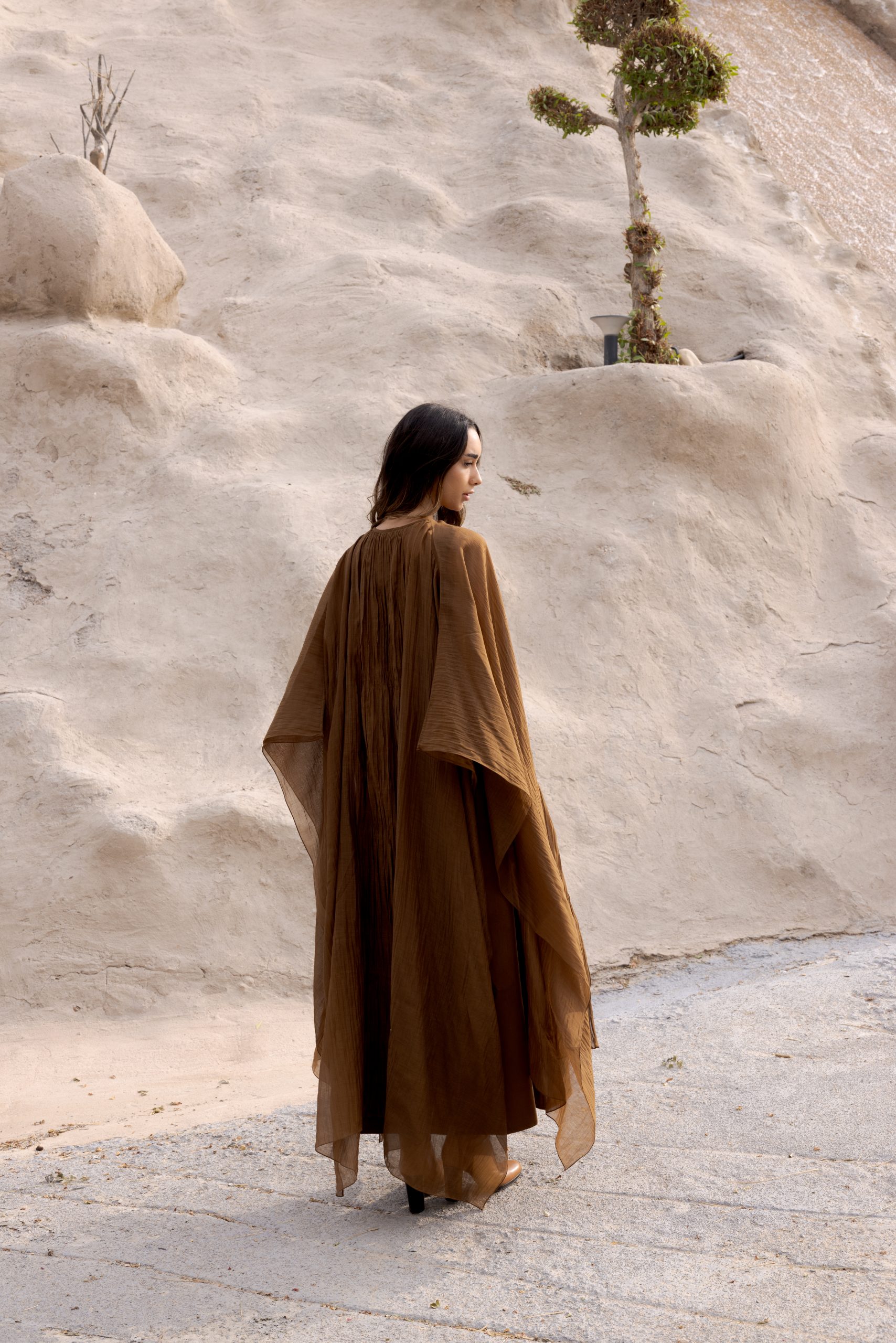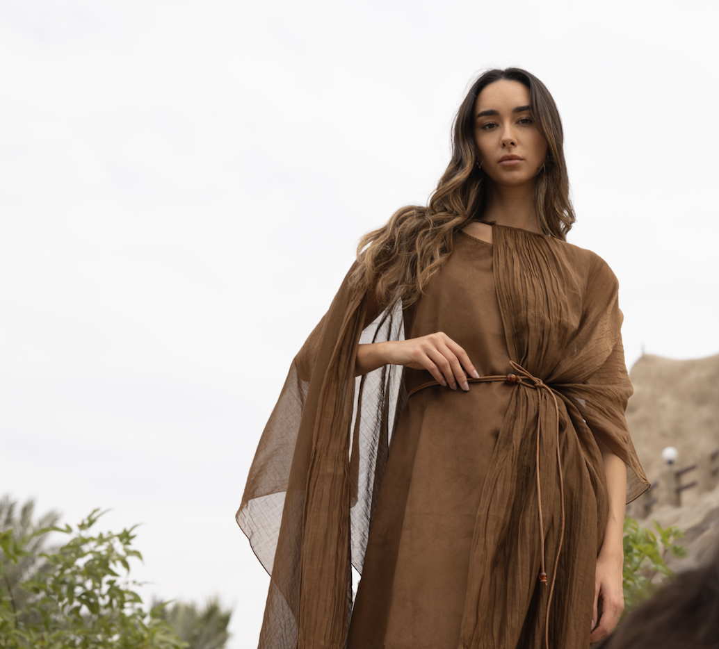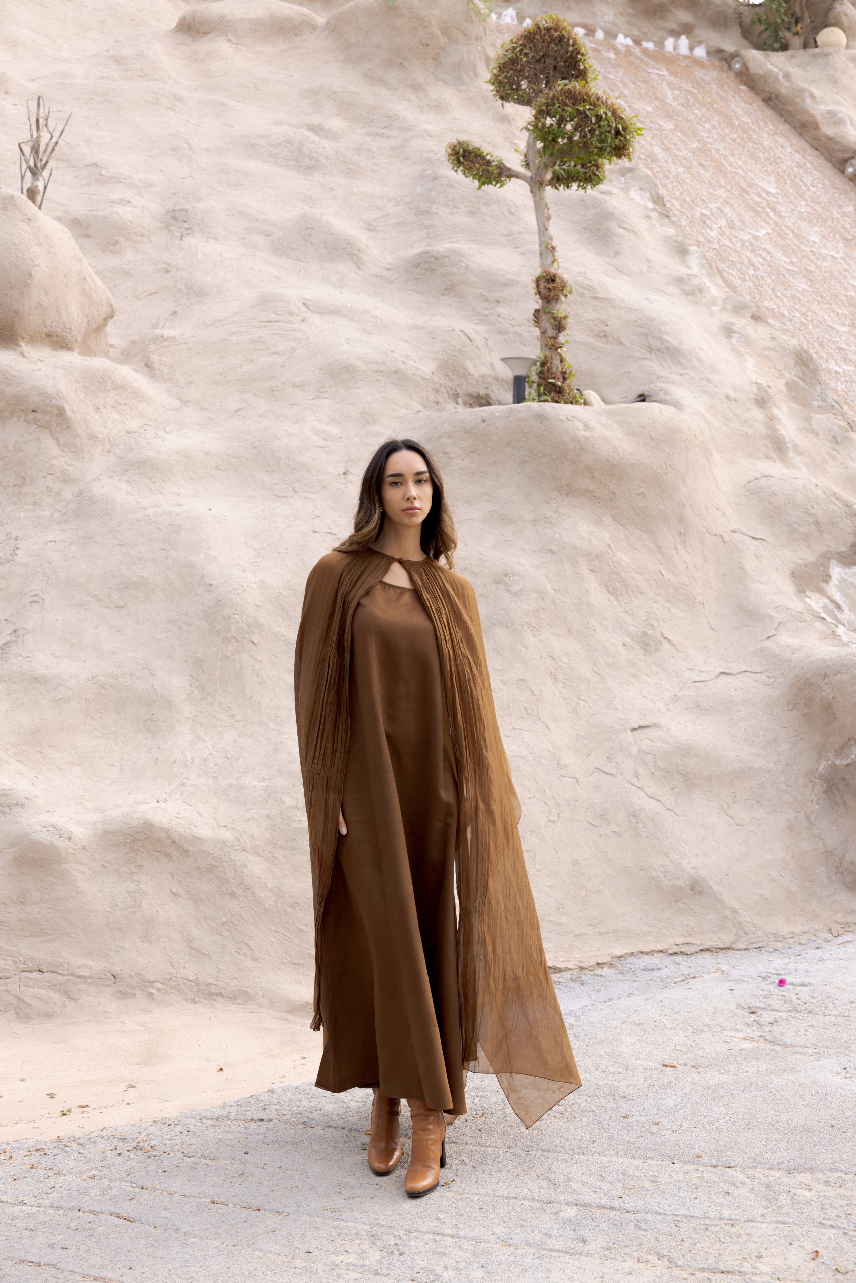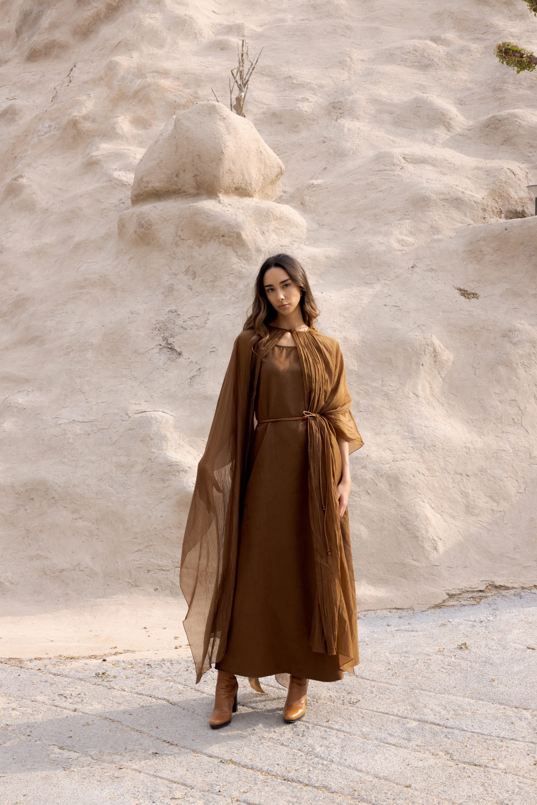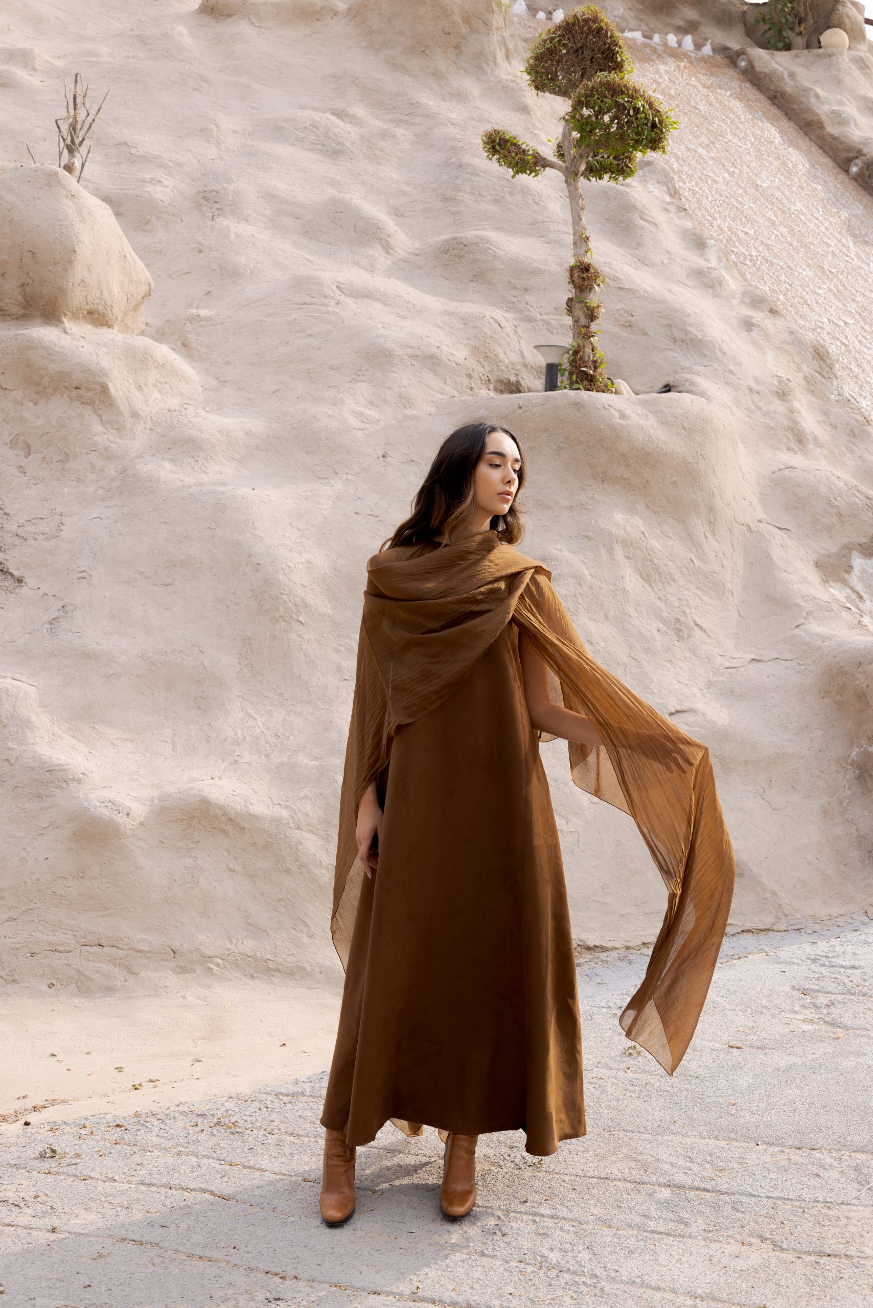 This piece features a lightweight suede inner dress layered under a flowing, silky Chanderi top, both custom-dyed in the same warm, earthy shade for a seamless monochrome look. The Chanderi layer can be worn open, with a belt for a softly defined silhouette, or swept to the side as a delicate scarf, giving it a beautifully versatile elegance.
